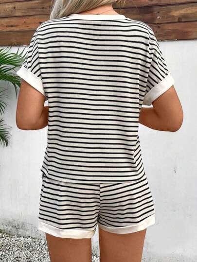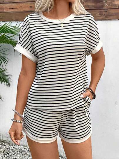 SHEIN LUNE Plus Size Striped Print Crew Neck Short Sleeve Top And Shorts 2 Pieces Set